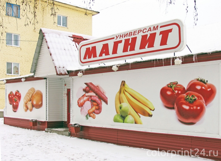- Изготовление экономичной наружной рекламы. При открытии магазина или офиса необходимо производство вывески, которую можно изготовить из баннерной ткани. Кроме того, можно напечатать баннер дешево и поместить его на стене фасада здания возле входа – это привлечет внимание потенциальных покупателей и увеличит объем продаж.